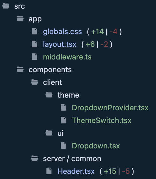 - User의 interaction에 따라 모드가 바뀌는 부분(Dropdown과ThemeSwitch)은 client에 위치합니다.