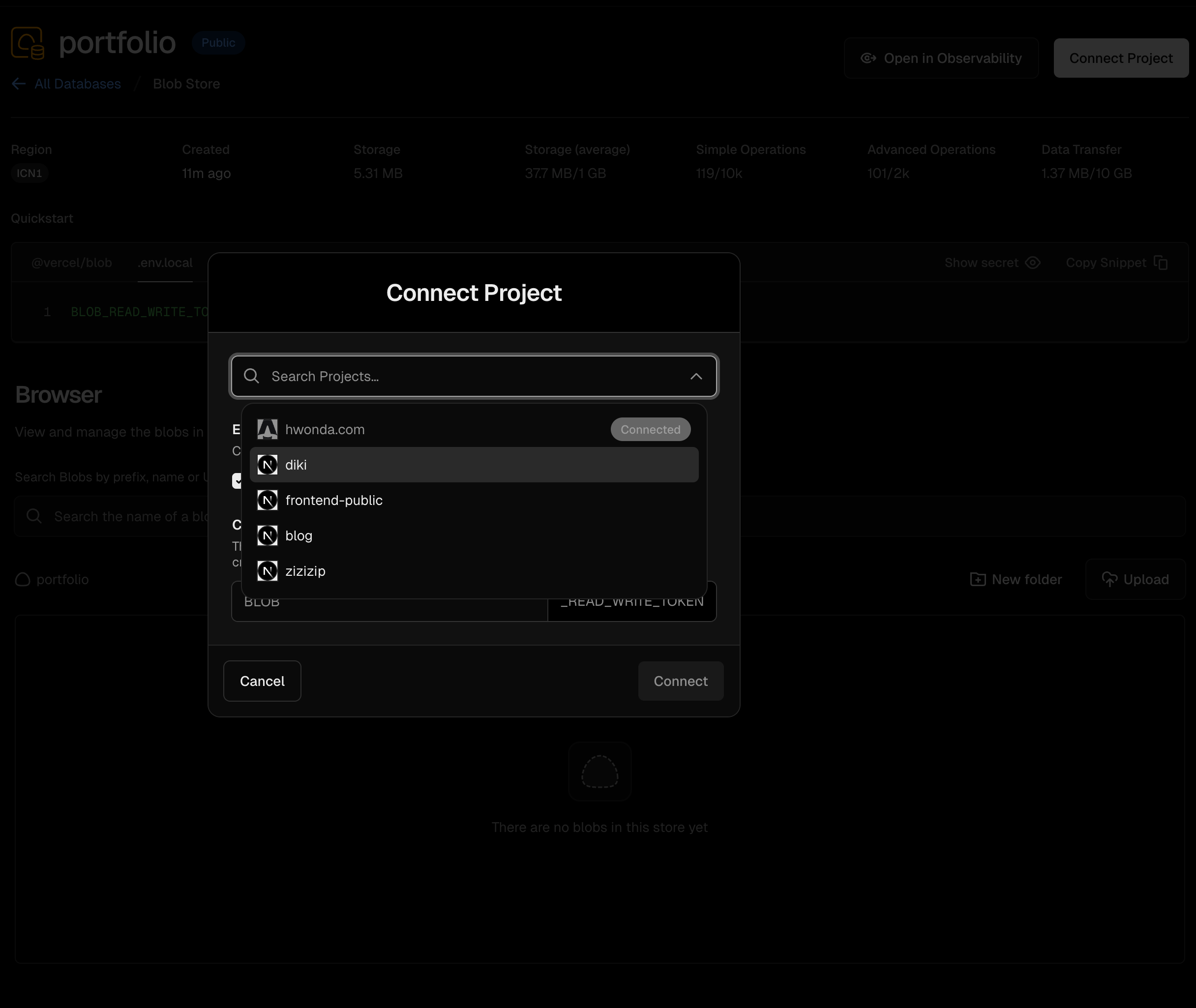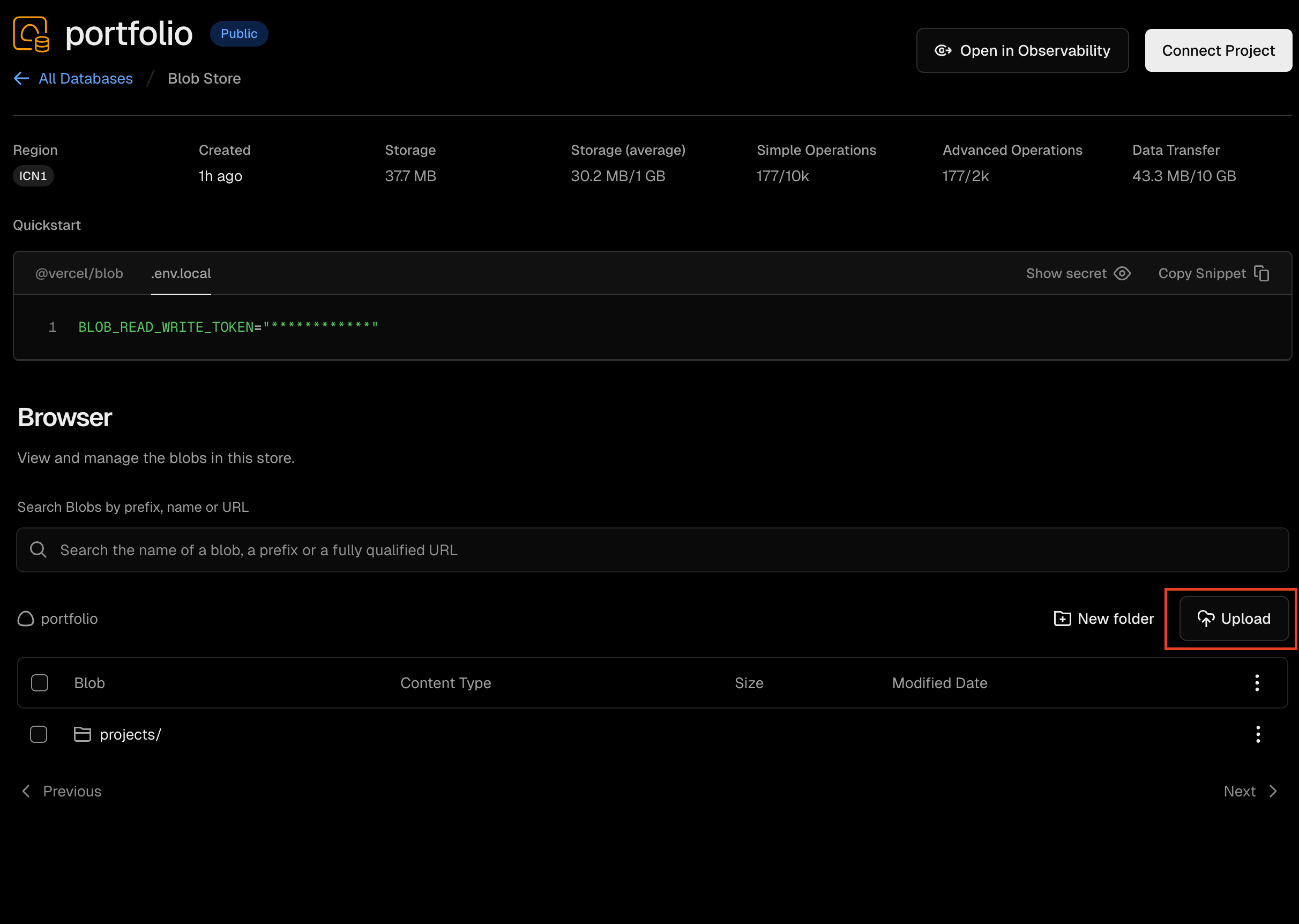 연결하면 BLOB_READ_WRITE_TOKEN 환경변수가 프로젝트에 자동으로 주입됩니다. 그리고 브라우저에서 바로 업로드하면 됩니다.
