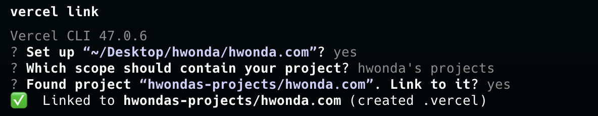 Terminal에서 vercel link 명령어를 입력하여 프로젝트에 연결합니다.