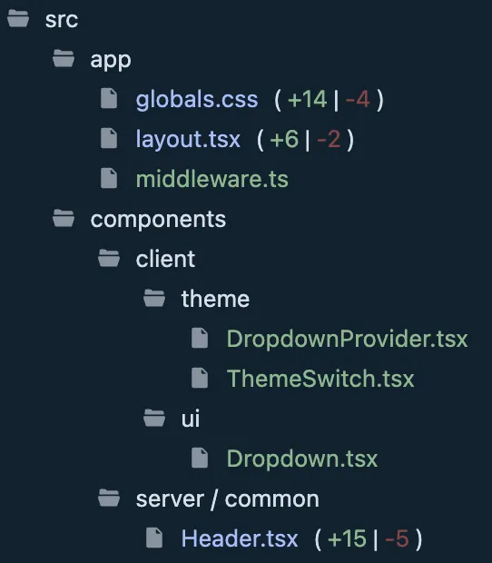 Dropdown과ThemeSwitch)은 client에 위치합니다. - 모드에 따라 변하지 않는 부분(