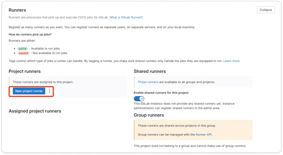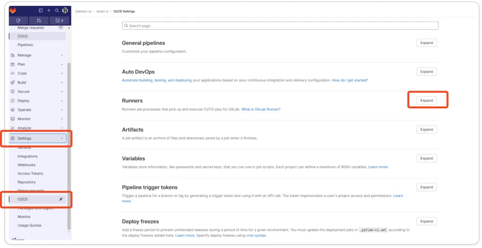 [Settings] - [CI / CD] - [Runners]로 이동한 후 [Expend]를 클릭합니다.