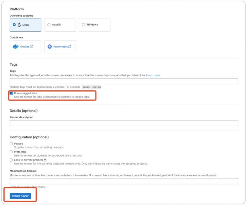 적절한 OS를 선택하고, Run unstaged jobs 옵션을 체크하여 스테이지되지 않은 작업도 실행할 수 있도록 합니다. [Create Runner]를 클릭합니다.
