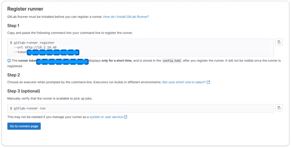 이제 Gitlab Pipeline을 구축하기 위해 runner를 등록해야 합니다. 먼저 Gitlab에서 토큰을 발급받고, 이 토큰을 사용하여 서버에 runner를 등록합니다.