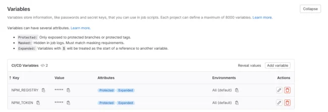 [Settings] - [CI/CD] - [Variables]에서 NPM_TOKEN 변수를 추가합니다.