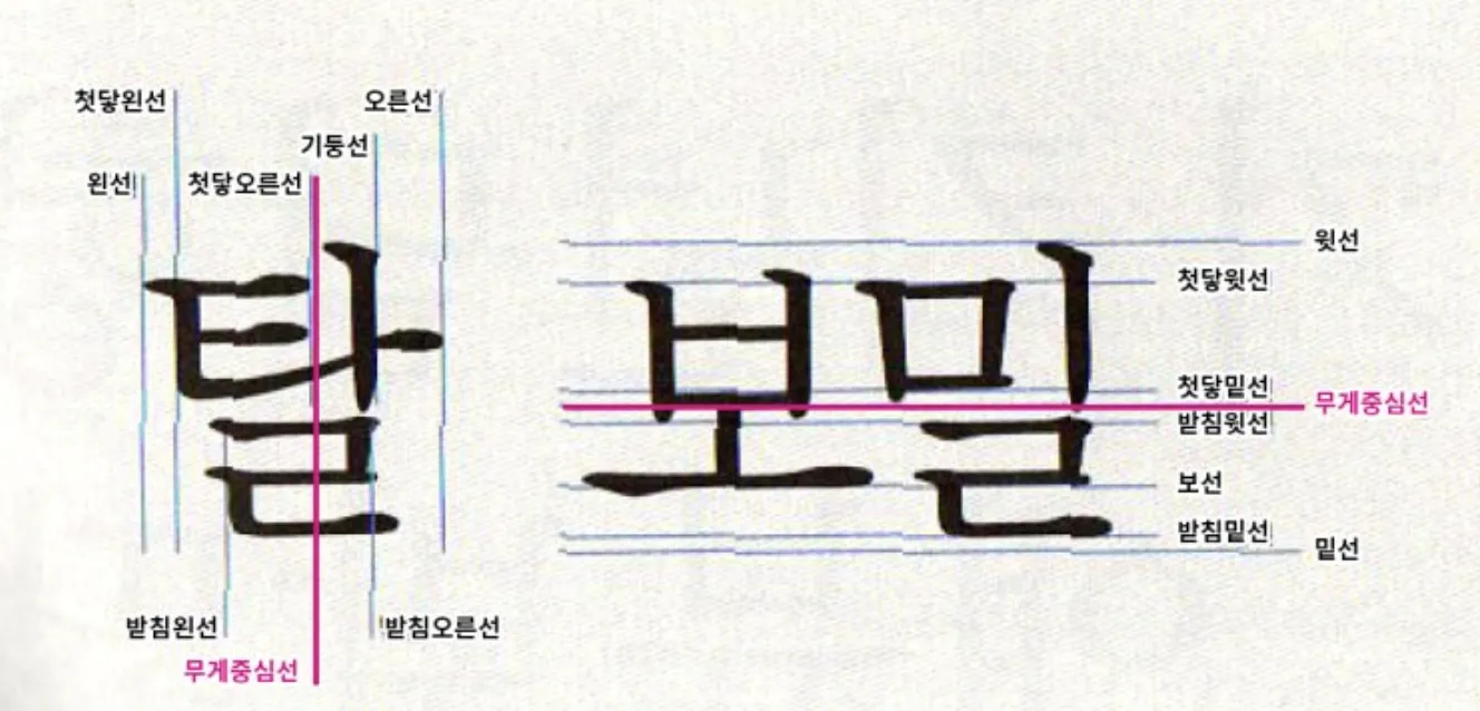 한글 단어의 무게중심은 일반적으로 왼쪽과 오른쪽이 균형 잡힌 편이지만, 미묘하게 왼쪽으로 치우친 듯한 인상을 주는 경우가 종종 있습니다. 이건 몇 가지 타이포그래피적 특성과 자소 배치 방식에서 기인한다고 합니다.