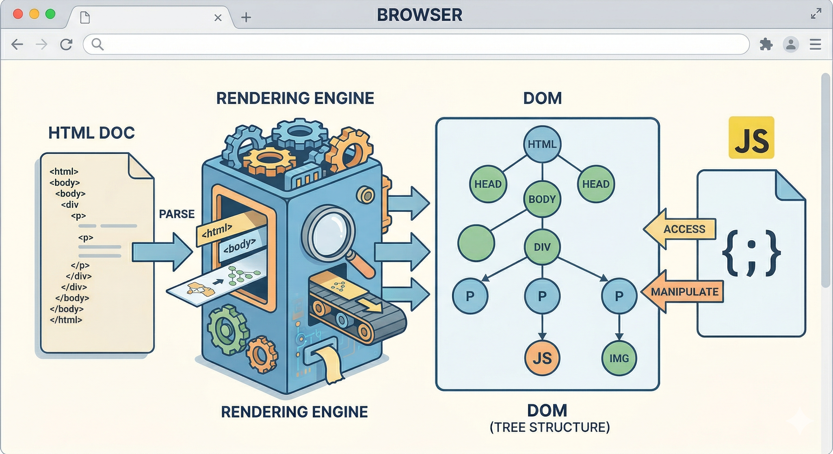 다시 말하면, 자바스크립트가 HTML을 직접 이해하는 것이 아니라, 브라우저가 HTML 문서를 DOM이라는 객체 구조로 바꿔주고, 자바스크립트는 그걸 이용해 문서를 다루는 것이다.