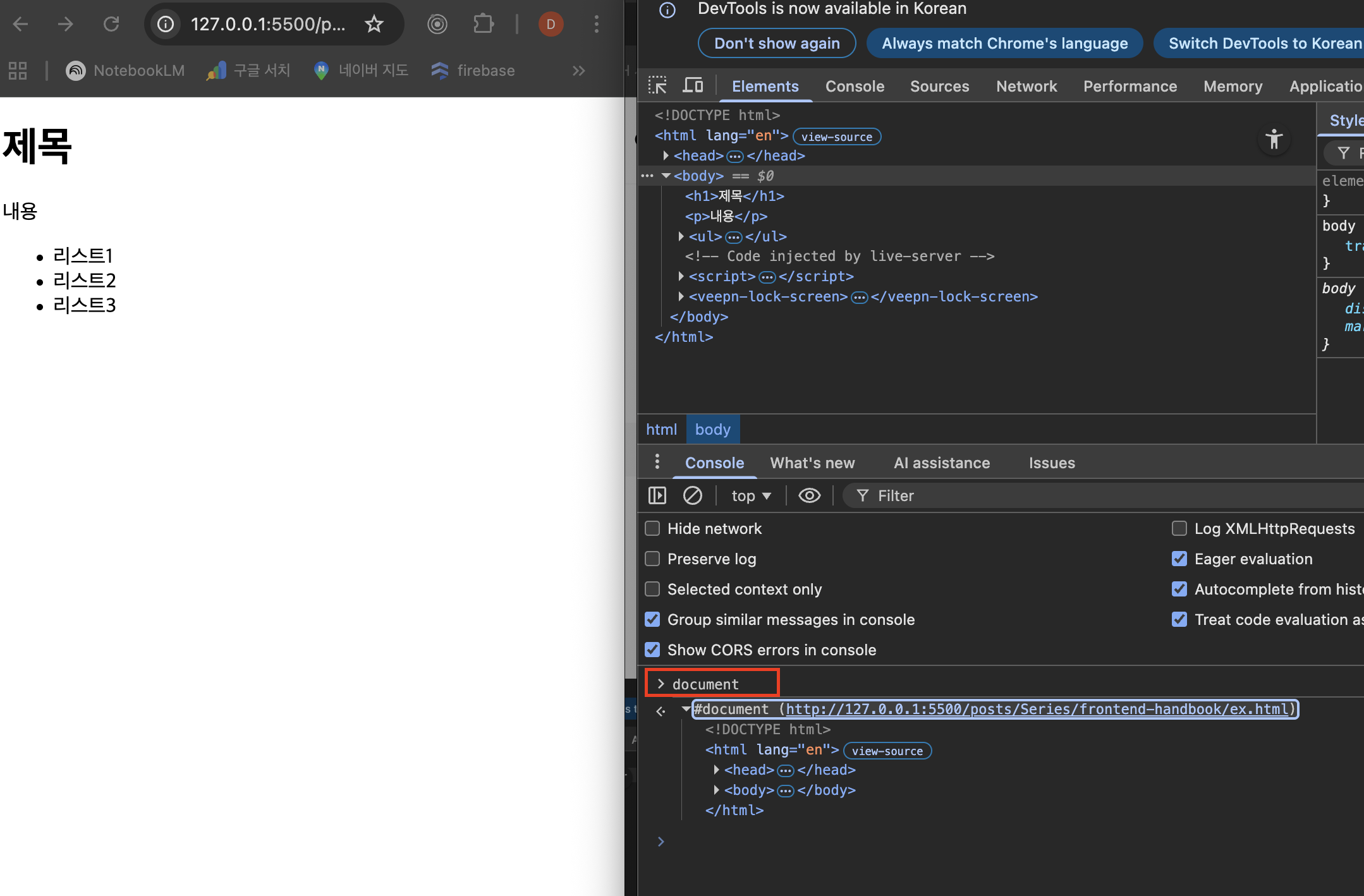 이렇게 하면 자바스크립트가 document.querySelector 같은 선택자를 통해 DOM 요소에 접근할 수 있게 된다.
