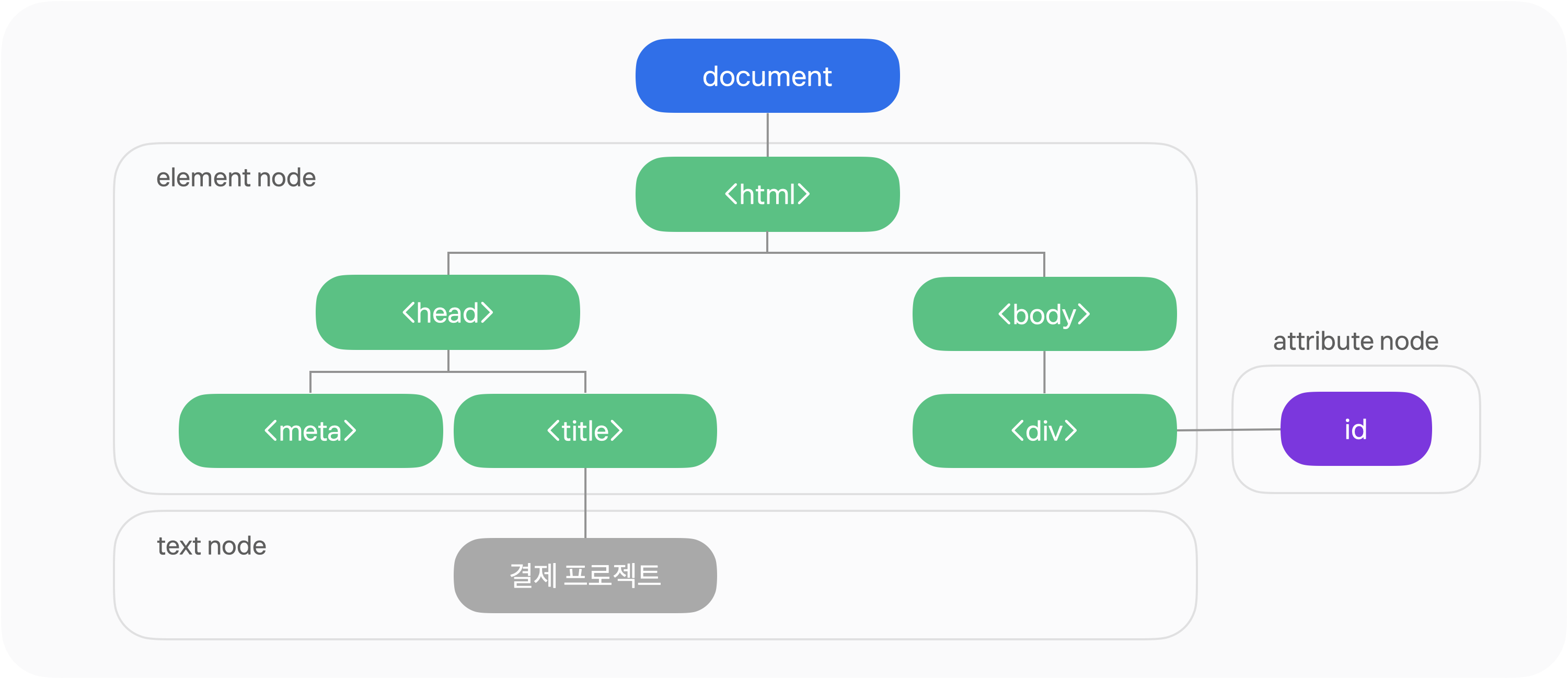 - document node : 최상위 노드. HTML 문서 전체를 의미