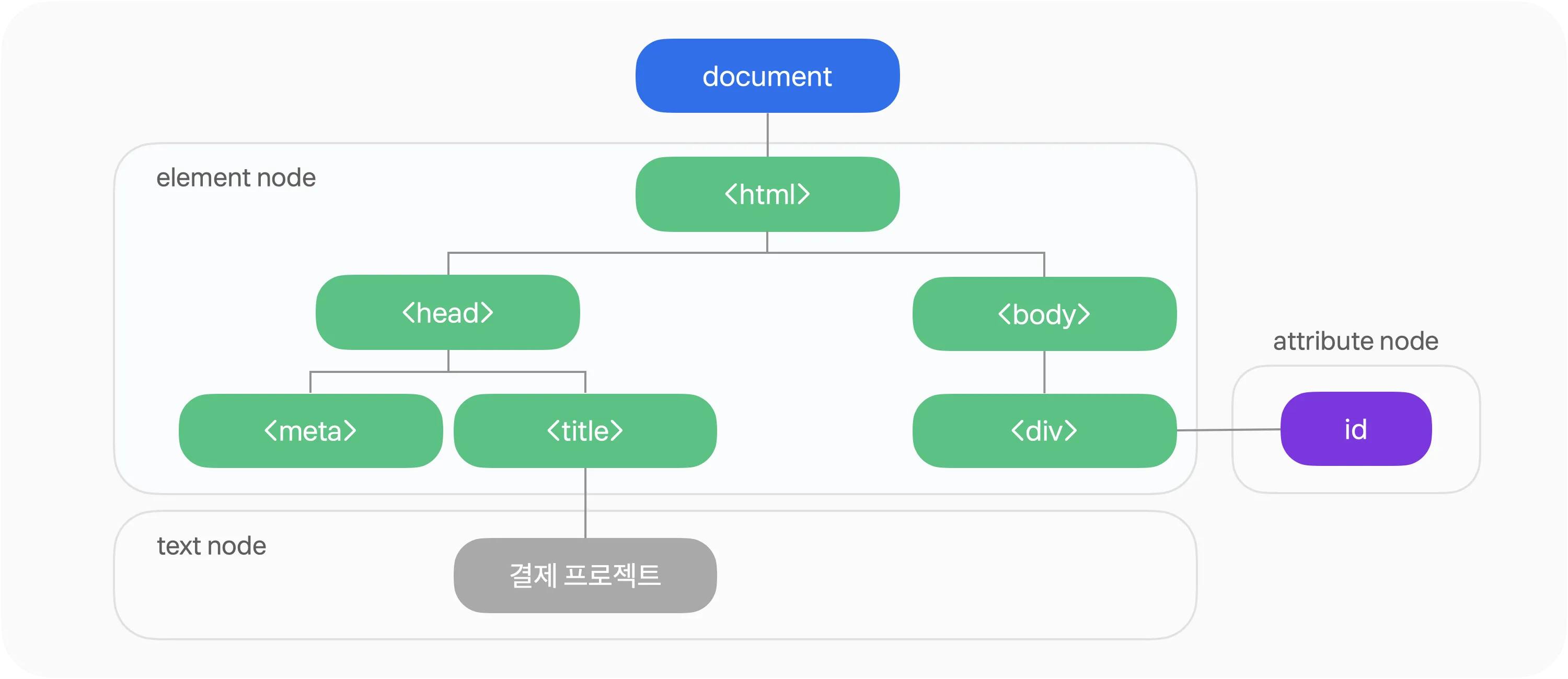 - document node : 최상위 노드. HTML 문서 전체를 의미