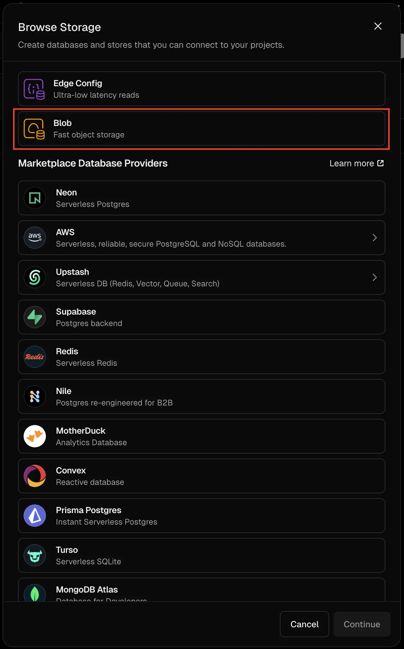 - vercel.com > Storage > Create Database > Blob
