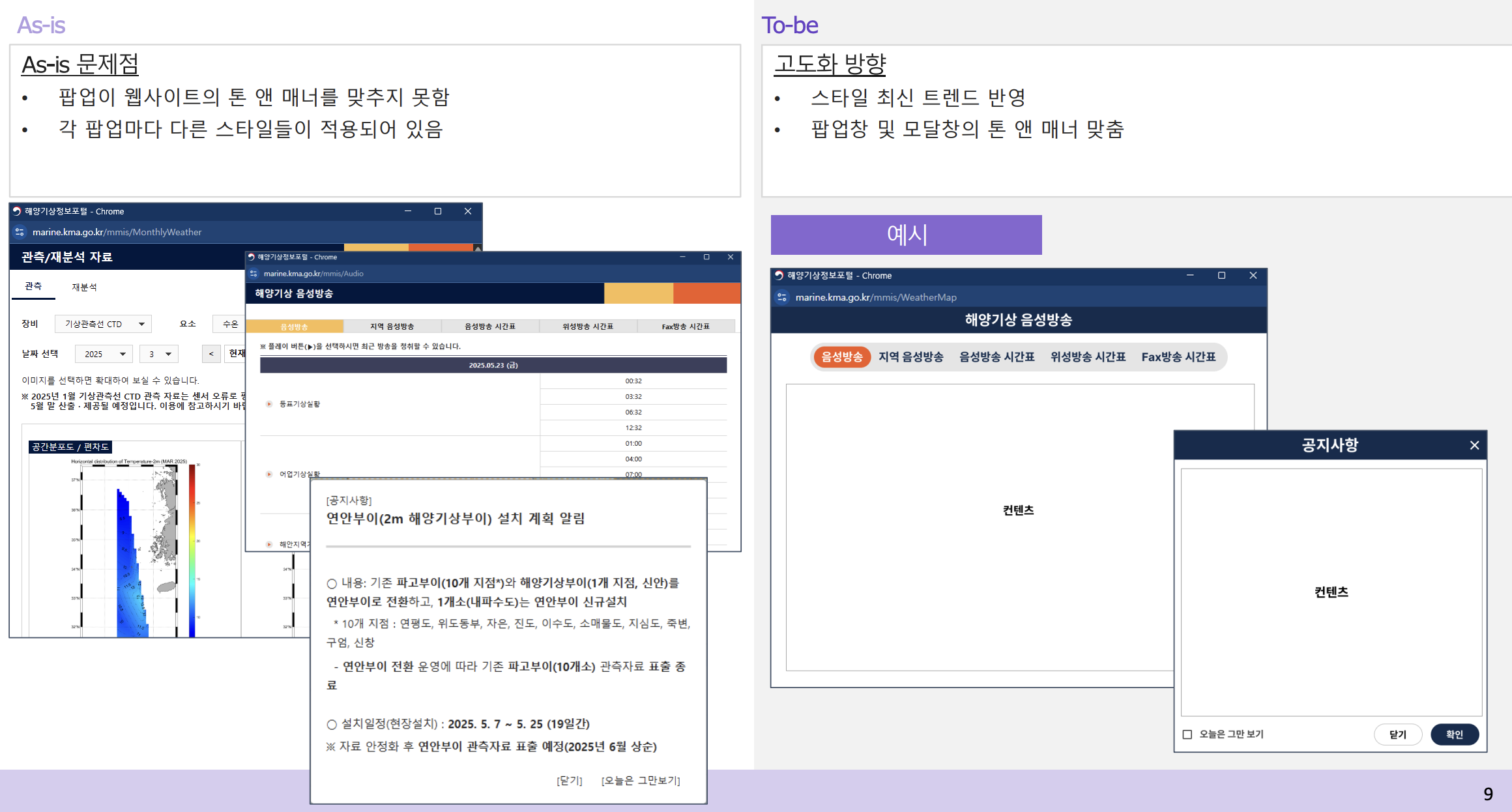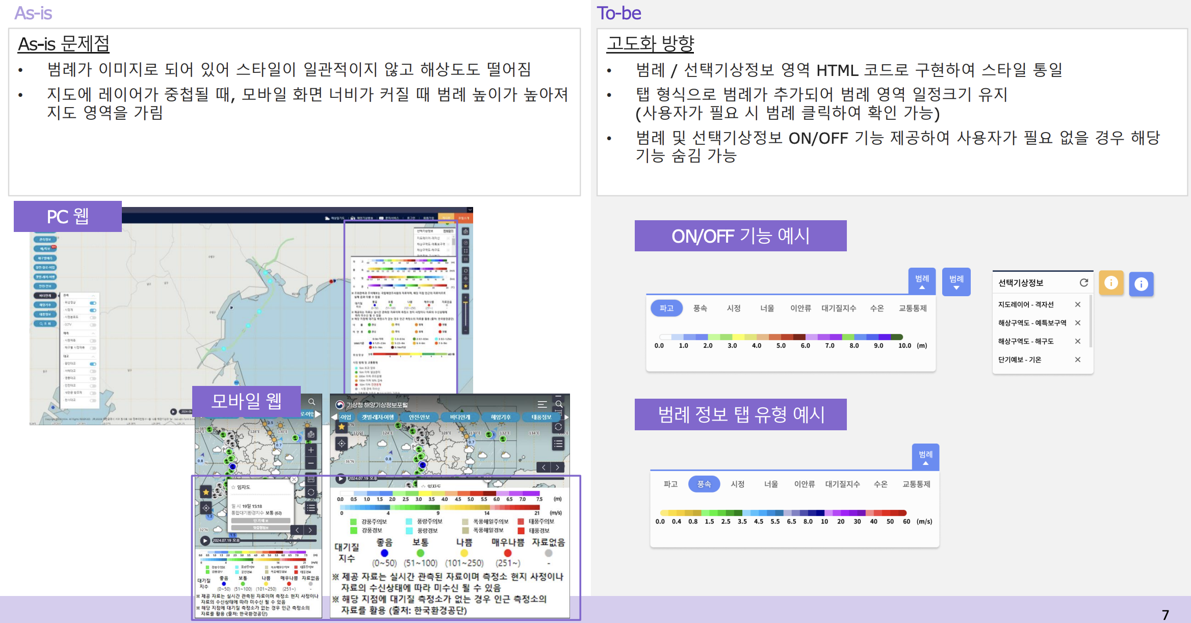 기상청 대국민 서비스의 노후화된 UI 개선을 위해 기획, 디자인, 개발 전 과정을 주도하며 PC/Mobile UI/UX 전면 개편 프로젝트를 리딩했습니다.주요 활동: