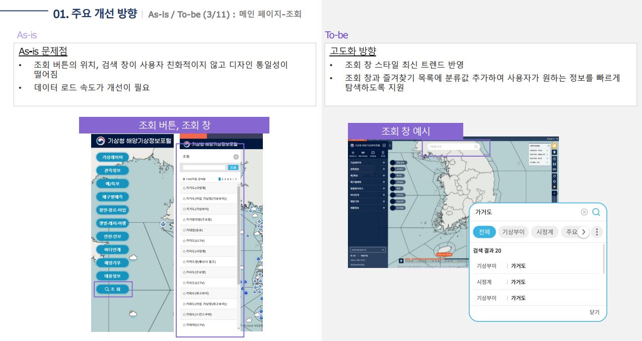 기상청 실무진과 협업해 불편 사항 도출 후 네비게이션 구조, 검색 위치, 타임슬라이더 UX 중심으로 핵심 흐름 재설계
